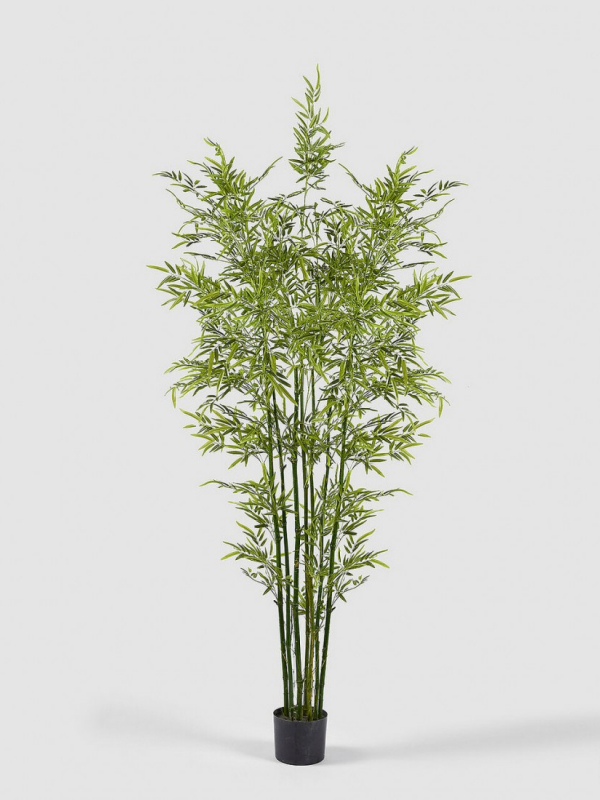 Bambus je zelená rastlina výška 210cm, rastlina je umelá - jedná sa o velmi realistické prevedenie. Rastlina je umiestnená v malom, ťaškom a umelom kochlíku. Termín dodania je 14 až 21 dní.